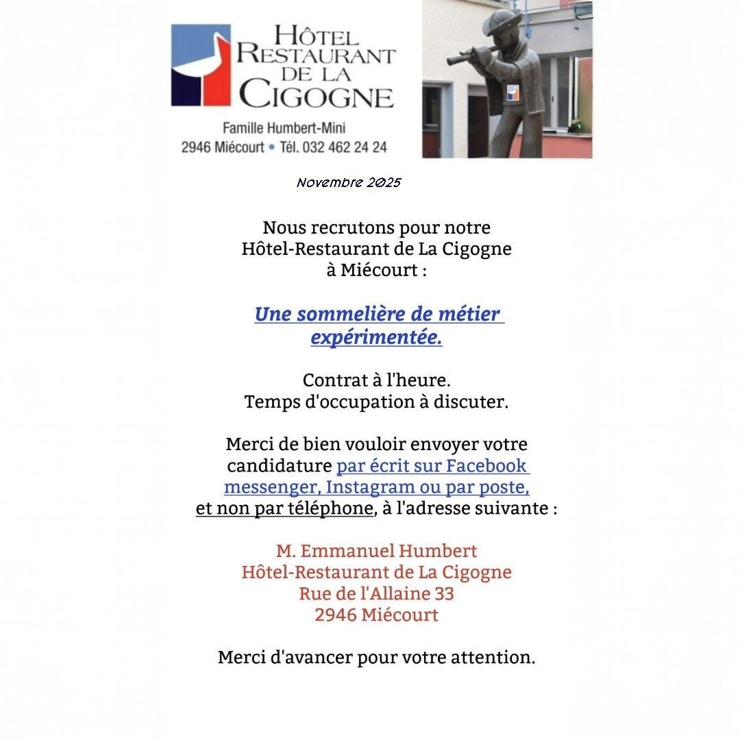 Voilà ce qui qualifie bien votre passage chez nous. Toute l'Equipe du Restaurant de la Cigogne à Miécourt se réjouit de vous recevoir à sa Table et vous souhaite la plus cordiale bienvenue dans un cadre agréable.